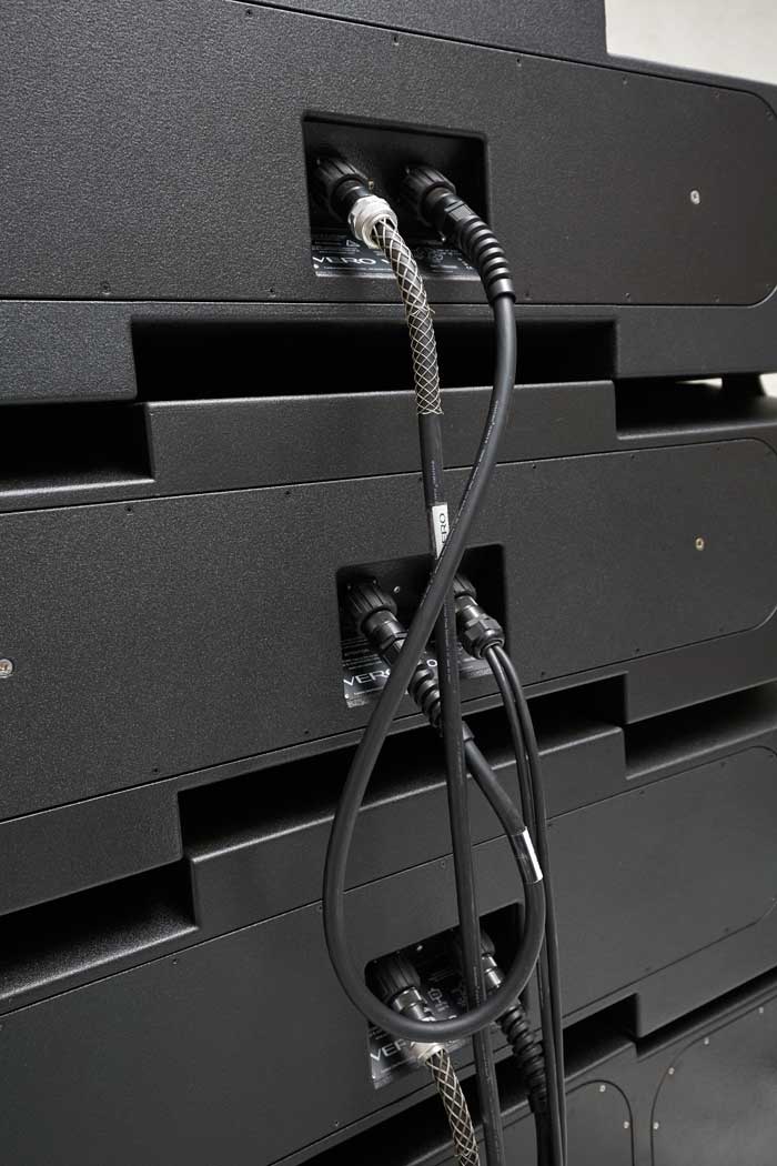 The speaker cabling features curl resistance, large cross section conductors and mil spec, quarter turn, multi-pin connectors. A 12-enclosure flown Vero array is powered by only two Lab.gruppen PLM 20K44s, making the system incredibly amplifier efficient. Vero has been designed and optimised without recourse to corrective EQ, preserving system headroom and transient response.