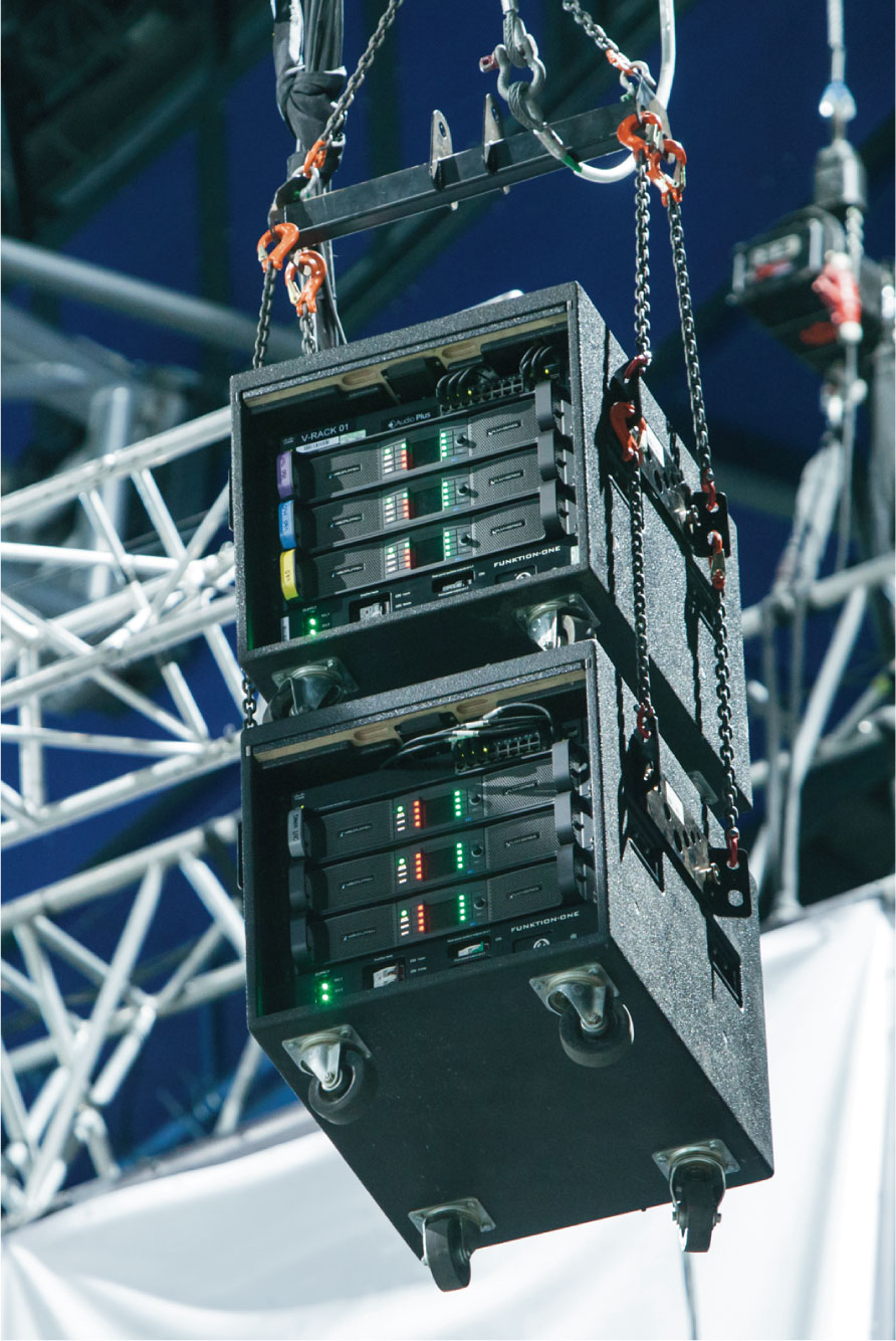 Three PLM 20K44 amplifiers and mains distro are fully shock mounted in an innovative, compact rack,complete with sliding doors that conveniently stow in the roof of the rack.