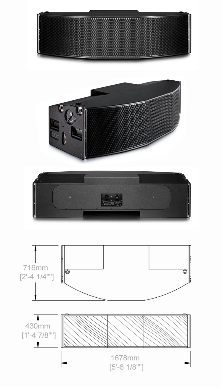 The Vero V60 is a flown mid-high loudspeaker providing 60° horizontal and 6° vertical coverage with a frequency response of 200Hz to 18kHz. It comprises two 10in Neodymium mid drivers with a sensitivity of 109dB 1W@1m and three 1.4in Neodymium HF drivers with a sensitivity of 112dB 1W@1m. The V60’s narrower dispersion angle projects mid-high frequencies to the far field. Weight 120kg
