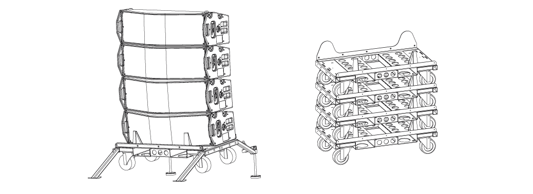 Dedicated outriggers can be added for safe ground stacking, enabling overall inclination or declination of the array. Dollies can be stacked for tidy storage during events.